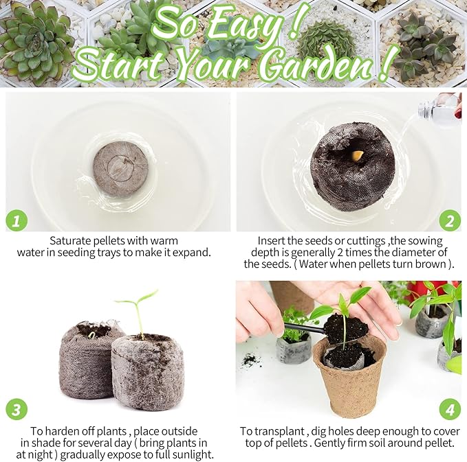- Premium Material: Peat pellets are made of peat, which has great aeration and water retention, so it is beneficial for plants to help plant growth, and can be completely degraded; They are small and compact, easily and cleanly storable, easy to transition into bigger containers
