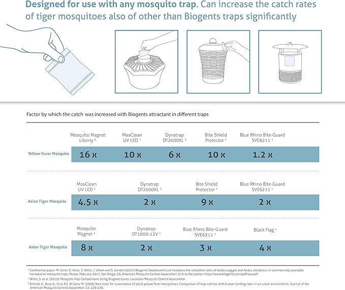 - VERSATILE: BG-Sweetscent can be used with most traps to improve their performance capturing certain mosquito species. Studies have shown that using this product can increase traps’ effectiveness in luring Asian tiger and yellow fever mosquitoes by many times. It is not recommended for use with the BG-GAT trap, which works by a different mechanism.