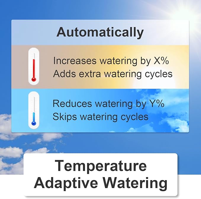 - Wireless Water Timer with Weather-Adaptive Control: Manage your garden watering system from anywhere via mobile/web apps. This smart sprinkler timer automatically adjusts irrigation based on real-time weather data, ensuring efficient water usage and conservation