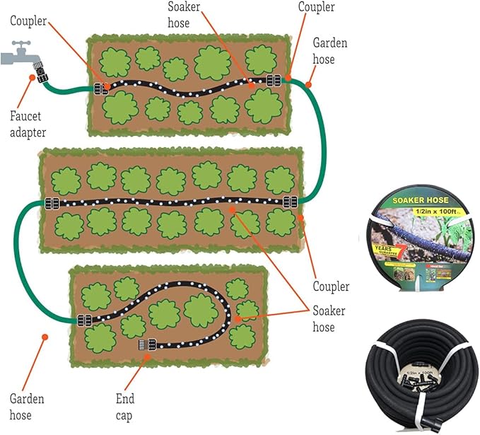 - Perfect Delivery of Water - Save up to 70% water. Evenly waters from beginning to end slowly, steady release at the soil line. This ensures that water is not wasted. The slow release allows the soil around plant roots to gradually absorb the water. And the proximity of the hose to soil means that very little if any is lost to evaporation.Liquid fertilizer can be used to distribute nutrients to planting through the soaker hose.