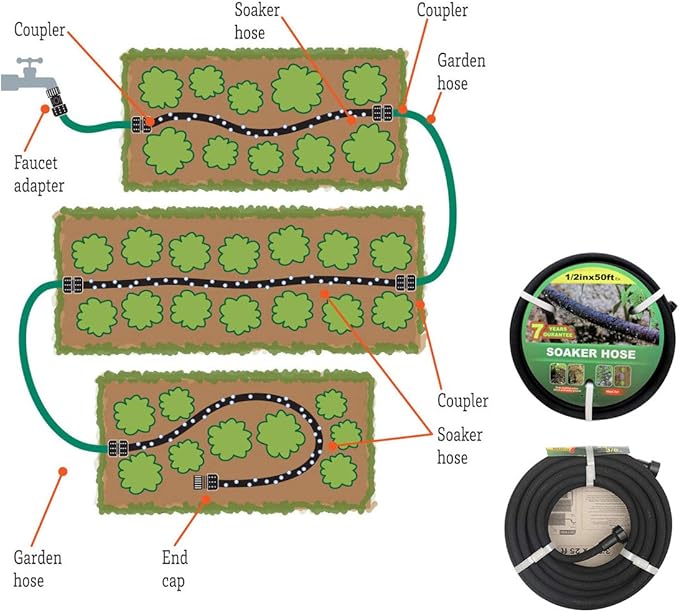 - Perfect Delivery of Water - Save up to 70% water. Evenly waters from beginning to end slowly, steady release at the soil line. This ensures that water is not wasted. The slow release allows the soil around plant roots to gradually absorb the water. And the proximity of the hose to soil means that very little if any is lost to evaporation.Liquid fertilizer can be used to distribute nutrients to planting through the soaker hose.