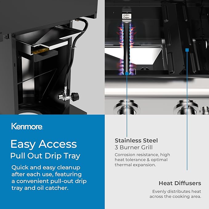 - 4 CASTER WHEELS FOR EASY MOBILITY β Who needs muscles when you've got wheels? The Kenmore 3-Burner Gas Grill comes equipped with 4 smooth-rolling wheels, 2 of which lock for added security and stability. No heavy lifting required! Take this grill on the go and lock it into place wherever you desire. Whether you're grilling up a storm on your backyard patio or taking it on the road to your next tailgate, this grill's got your back.