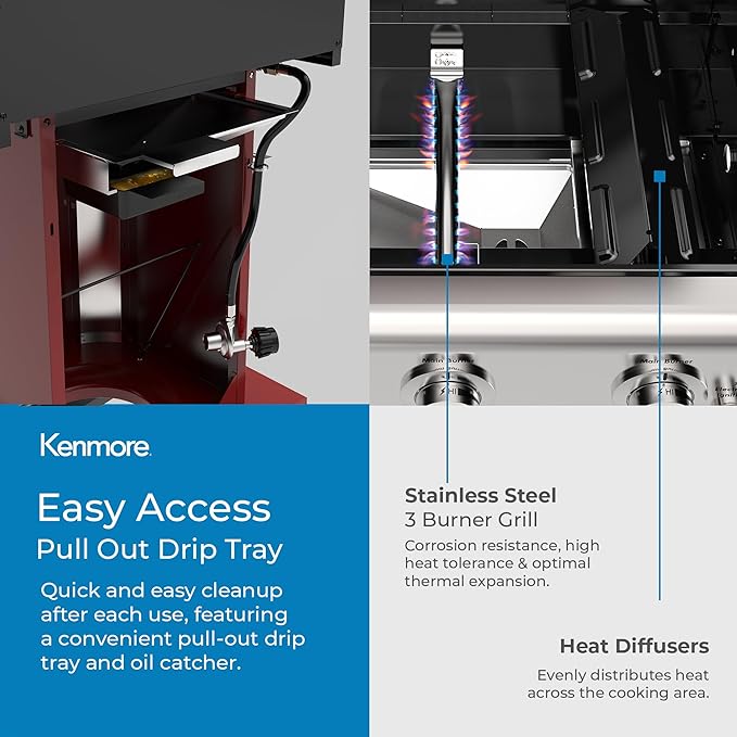 - 4 CASTER WHEELS FOR EASY MOBILITY β Who needs muscles when you've got wheels? The Kenmore 3-Burner Gas Grill comes equipped with 4 smooth-rolling wheels, 2 of which lock for added security and stability. No heavy lifting required! Take this grill on the go and lock it into place wherever you desire. Whether you're grilling up a storm on your backyard patio or taking it on the road to your next tailgate, this grill's got your back.