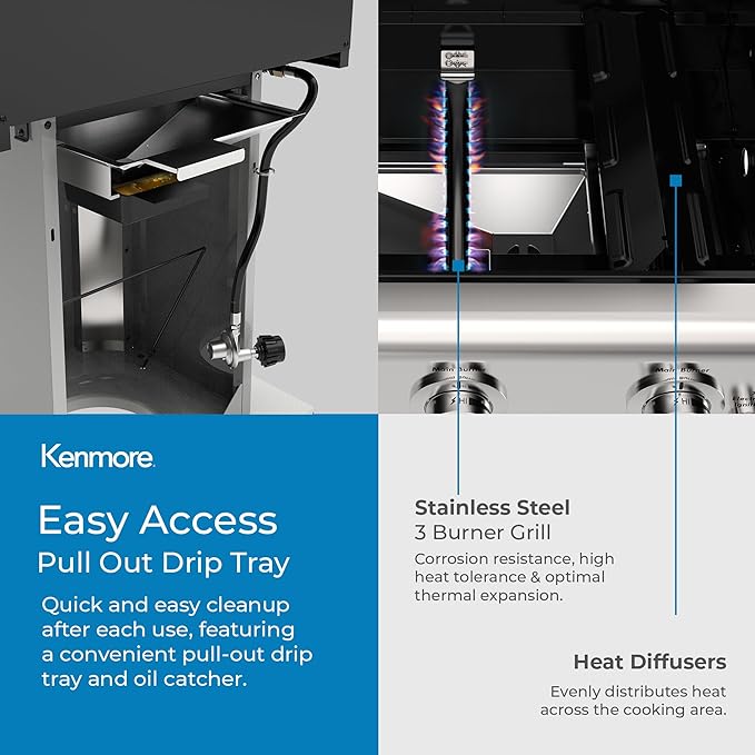 - 4 CASTER WHEELS FOR EASY MOBILITY β Who needs muscles when you've got wheels? The Kenmore 3-Burner Gas Grill comes equipped with 4 smooth-rolling wheels, 2 of which lock for added security and stability. No heavy lifting required! Take this grill on the go and lock it into place wherever you desire. Whether you're grilling up a storm on your backyard patio or taking it on the road to your next tailgate, this grill's got your back.