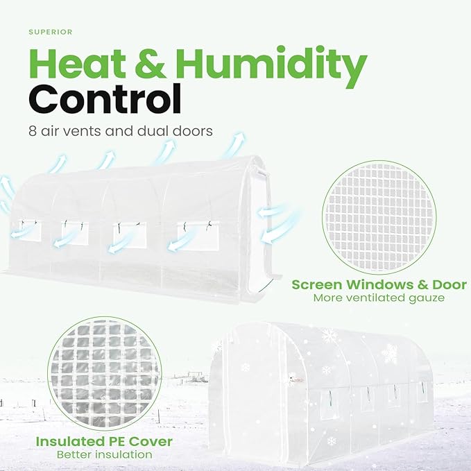 - [Temperature & Humidity Management]--Featuring 8 roll-up screen windows plus 2 door-netting, it facilitates temperature and humidity control. It increases temperature promoting early spring plant growth, enhances ventilation on hot summer days, and retains warmth during the winter. It keeps plants from pouring rain, winds, and snow.