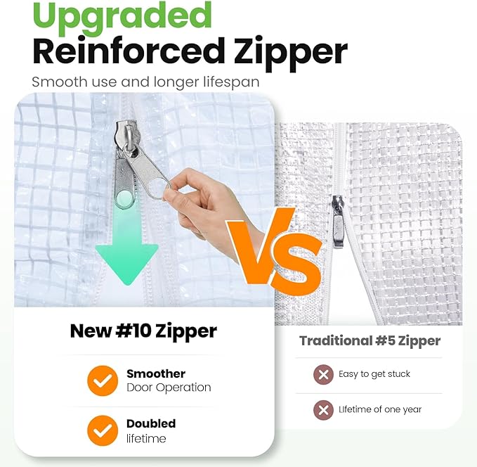 - [UVI 6 Protected Cover]--Waterproof 150g/sqm PE grid cover is UV Index 6 protected, protects your plants from excess rays, which doubles the service life: Compared to other greenhouse(UVI 1-3) that only lasts for 1-6 months, the KING-cover lasts for over years. The reinforced odorless PE covering material provides safe work zone. The cover fits the frame closely, enhancing warmth and wind resistance.