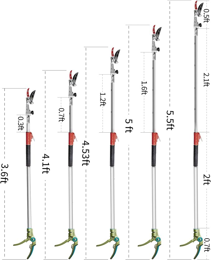 - [Extendable Length] The pruners pole is creatively designed to extend from 3.67-5.45 feet which allows an added 3 to 5 feet reach for climbers, trees or hedges which are 10 feet high for trimming or cutting purpose.