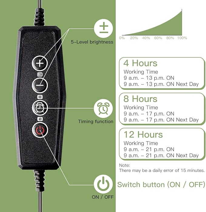 - 🪴Timer & Dimmable Function - The growing lamp is designed 3 time settings - 4/8/12 hrs,when kept plugging in, it will Auto ON/OFF and no more manually operation everyday. The light intensity is also adjustable with a controller so you can make sure your plants survive.