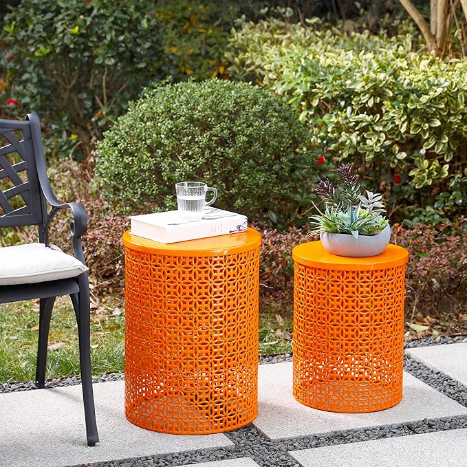 Glitzhome Outdoor Side Table Set of 2, Decorative Garden Stool for Indoor Outdoor Heavy Duty Metal Frame Accent Table Modern End Table, Glossy Orange
