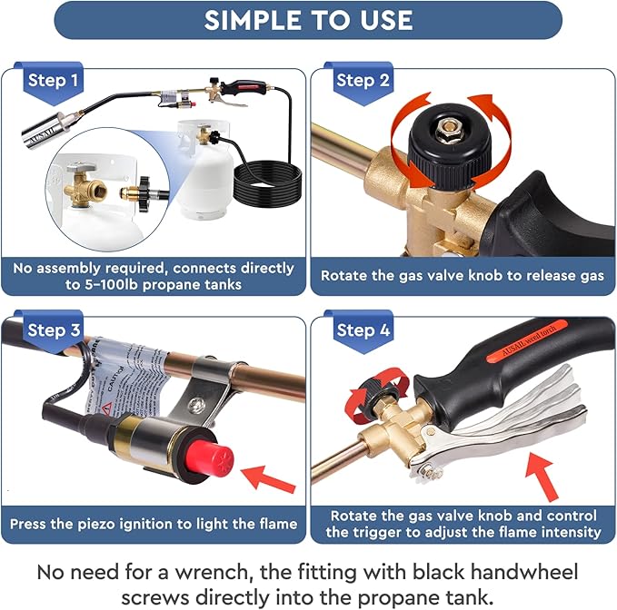 - ★【Powerful Propane Weed Burner Torch】Piezo electric ignition to ensure safety, heats-up to 3600° F with ease, high heat output.Equipped with an ergonomic luxury handle to increase comfort during use.
