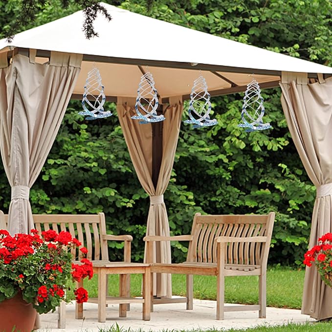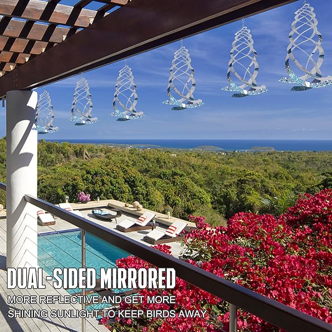- BIRD REPELLENT SPIRAL REFLECTORS: Our visual reflective ornamental spinner uses wind motion and light reflections to keep birds away coming from any angle. 6 pack shiny reflective Mylar pinwheels can rotate easily in the breeze, protect your garden, farm, and lawn by creating a bright flash that scares away birds.