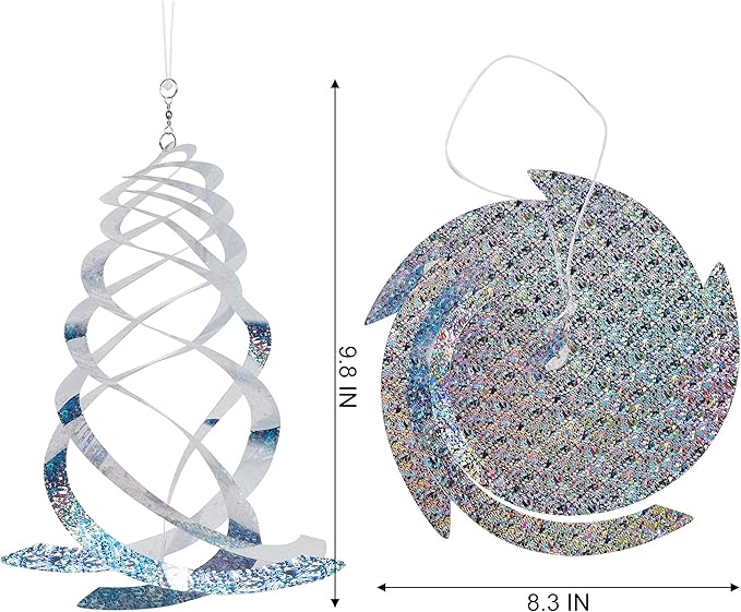 - GARDEN DECORATION: Garden silver Mylar spinner is 9.8 inches tall that enough to attract the attention of birds from a distance. They are dual-sided mirrored, so they are more reflective and get more shining sunlight to scare birds away. They are so beautiful as they spin in the wind and reflect sunlight.