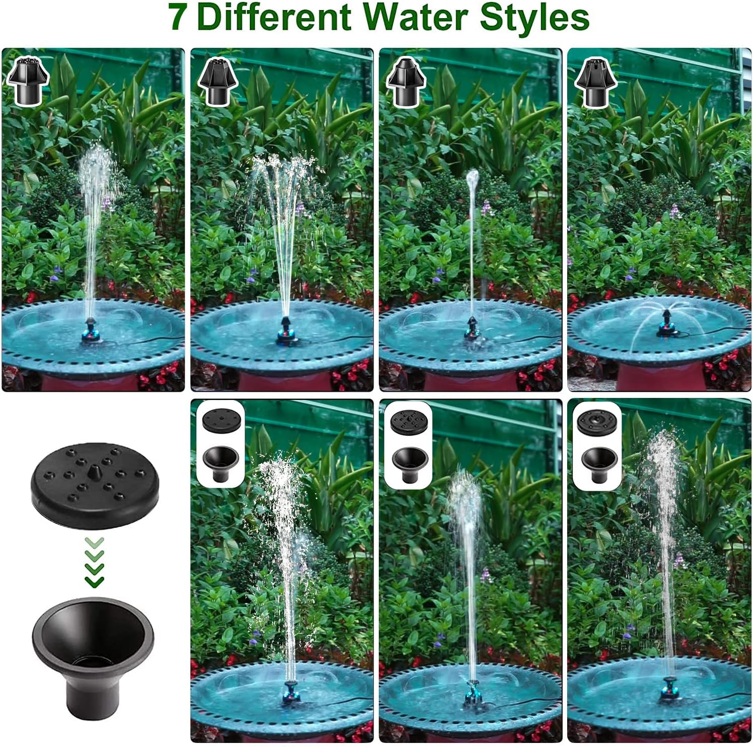 - 6 Colorful LED Lights Water Fountain Pump: The fountain pump is equipped with 6 high-brightness LED lights, so that your garden can become colorful during the day and night; The RGB color automatic cycle setting makes the night in your yard more romantic and beautiful; And with 7 nozzles, there are 7 different fountain modes, you can easily disassemble and replace