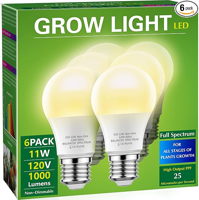 Briignite Grow Light Bulbs, LED Grow Light Bulb A19 Bulb, Full Spectrum Grow Light Bulb, Plant Light Bulbs E26 Base, 11W Grow Bulb 100W Equivalent, Grow Light for Indoor Plants, Seed Starting, 6 Pack