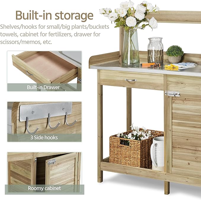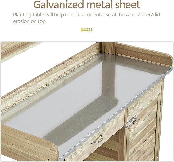 - PREMIUM FIR WOOD: Made of 100% fir wood, this garden table for horticulture is body-harmless. You can transplant edible vegetables or herbs on it. Combined with its solid structure, this potting tabletop can hold up to 100 kg/ 220 lb and 80 kg/176 lb for the bottom shelf and cabinet