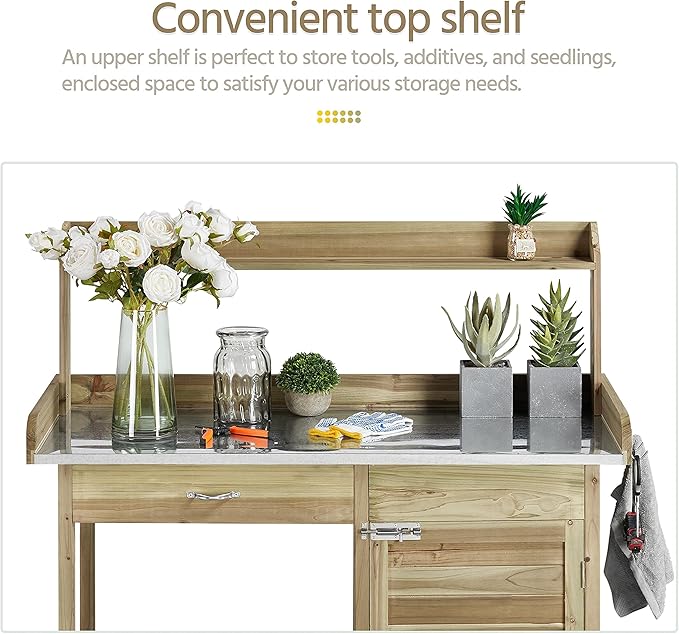 - THOUGHTFUL DETAILS, PLEASANT PLANTING: This outdoor bench for horticulture comes with 3 side hooks for hanging tools, fire pokes, or bags. The raised tabletop edges can prevent the items from falling down. The elevated shelf can house your planted flowers and unused tools without taking up your valuable operation space