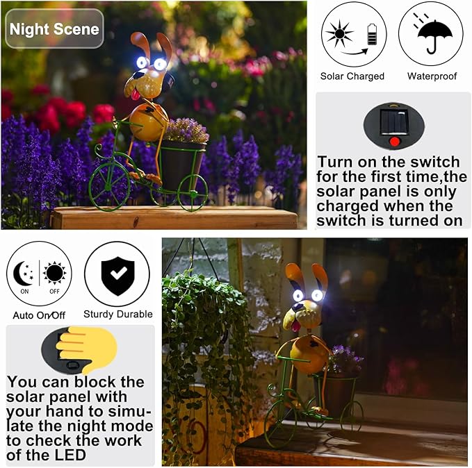 - 🐶【Solar Bicycling Dog with LED eyes】The whole dog is made of metal, the product is solar energy charged,Size of dog14x11x5inch.It will be charged during the day in the sun, and the dog's LED eyes will automatically light up at night, which can decorate your courtyard.