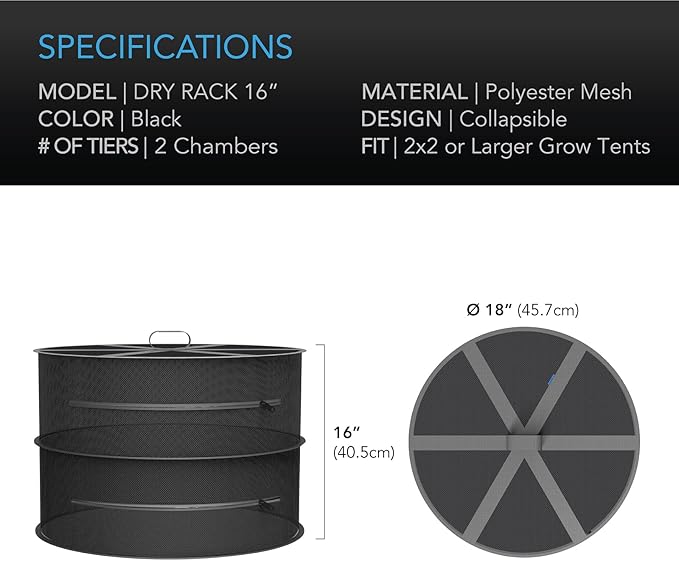 - 2 Tiers | 18 in. Diameter | Fits 2x2 or Larger Grow Tents | Includes Hanging Hook & Carrying Bag