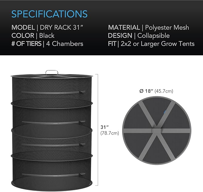 - 4 Tiers | 18 in. Diameter | Fits 2x2 or Larger Grow Tents | Includes Hanging Hook & Carrying Bag