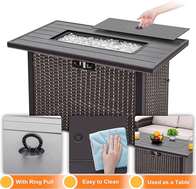 - EXTRA ROOMY STORAGE SPACE: The excellent patio fire pit table is ideal for decorating yard, poolside, balcony, garden and porch. The elegant outdoor furniture can also be used as an outdoor table all year round by simply covering the burner with the included lid