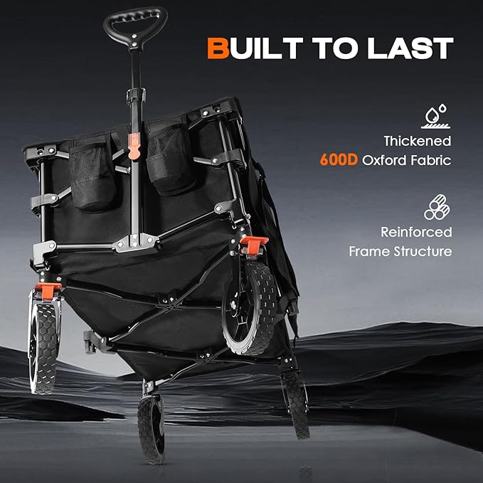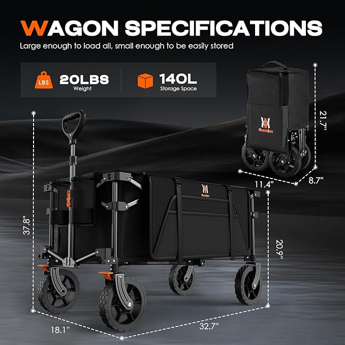 - 【Superior Material & Easy to Use】: Everyone would like to get a wagon featuring larger capacity, high quality and portability, our wagon could meet all your needs and be your best choice. The fabric material is made of 600D fabric and PVC coating to waterproof and durability. Unique frame structure design is for Sets up in seconds, no assembly required. The fold size is 21.7" x 11.4" x 8.7", which is easy to operate and transport.
