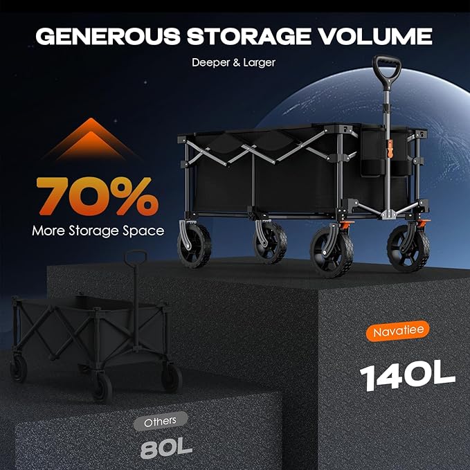 Navatiee 140L Collapsible Foldable Wagon with Wheels, Large Capacity Foldding Wagon Cart with Side Pocket and Brakes, Grocery Shopping Cart for Garden Outdoor Use, Black