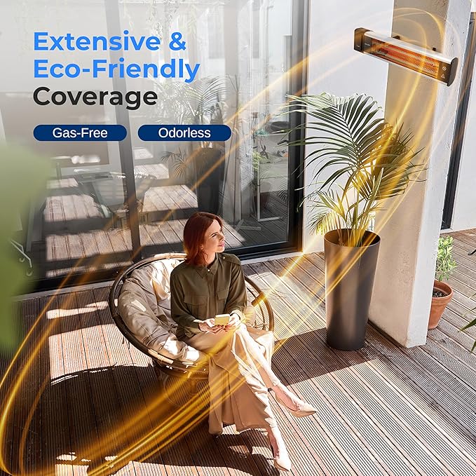 - INSTANT WARMTH: Relax on cool days with our patio heaters for outdoor use, delivering sun-like, odorless heat in seconds—no gas or propane needed. Two heat levels and a remote control ensure immediate, convenient comfort.
