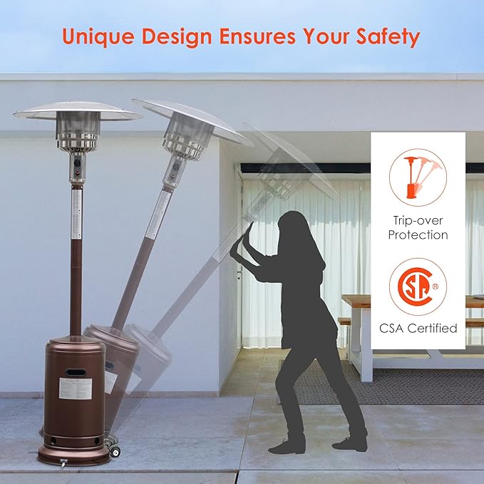 - Outdoor Heaters for Patio with Safety Protection: This outdoor heat lamp adopts an anti-toppling design to turn the heater off automatically if it tips over by accident, and the patio heater with CSA certification makes you feel relieved to use it. Besides, 3 stakes increase overall stability and safety.