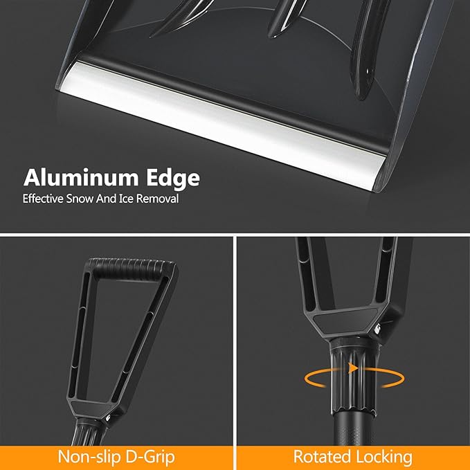 - STURDY AND DURABLE -- The handle of the snow shovels for snow removal is made of premium aluminum alloy, which is not easy to deform and ensures a longer service life. The PP head of the shovel makes it durable enough for a long time use. This snow shovel comes with a durable aluminum edge that makes shoveling more efficient and also protect the shovel head better.