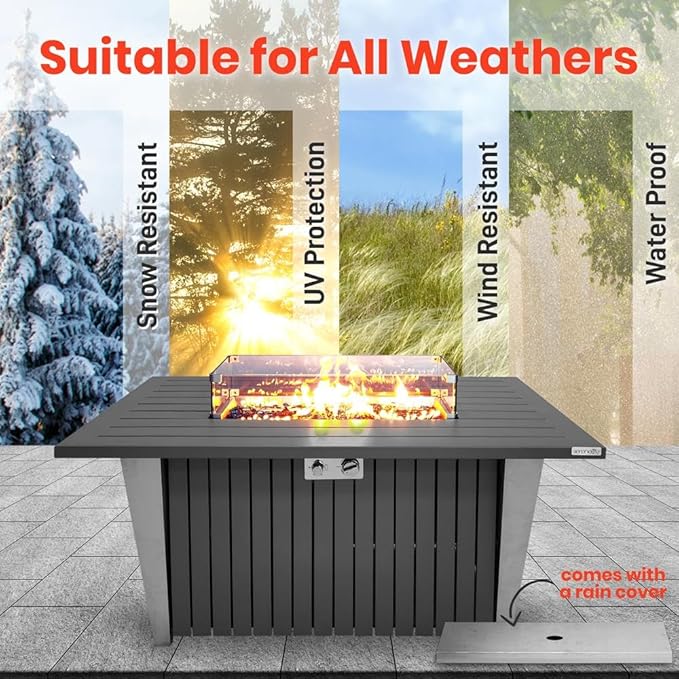 - MADE TO LAST: This sturdy outdoor propane gas fire pit table features weather-resistant heavy-duty steel + stainless steel construction materials & comes w/ a waterproof weather cover to protect it from UV rays, rain, snow, & dust all year round