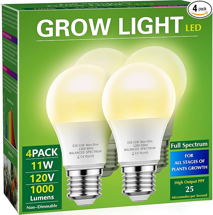 Briignite 4 Pack Grow Light Bulbs, LED White Bulb A19 Bulb, Full Spectrum Plant Bulbs E26 Base, 11W 100W Equivalent, for Indoor Plants, Seed Starting