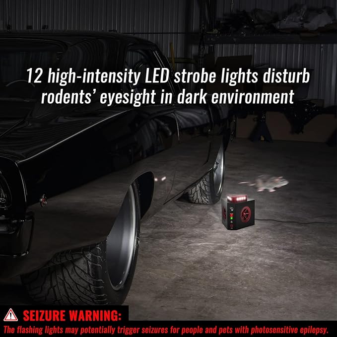 - 12 High-Intensity LED Strobe Lights with Dusk-to-Dawn Sensor: Equipped with 12 LED strobe lights, arranged in 3 groups on a triangular plate, this electronic rodent repellent target rodents' vision from all directions, using a dusk-to-dawn sensor to maximize the effect in dark environments, making it an ideal deterrent for mice, rats, and other pests.