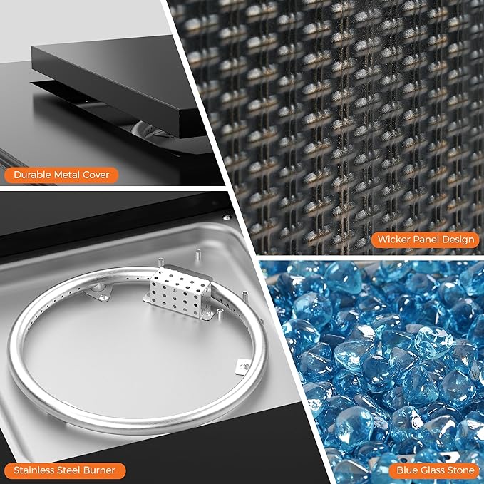 - Unique Design: Outdoor fire pit features a premium black finish and square table, adding a stylish touch to your outdoor space. Immerse yourself in the unique ambiance crafted by the glass stone reflecting dancing flames