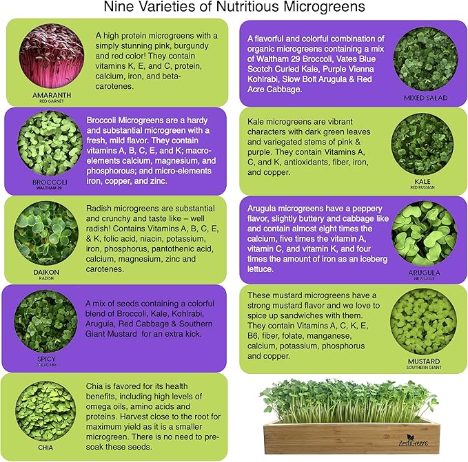 - Includes Organic Broccoli. Chia, Red Amaranth, Mixed Salad, Arugula, Daikon Radish, Southern Giant Mustard, Kale and Spicy Salad Mix. Seeds. Use 1 packet per tray for a full crop of delicious Microgreens.