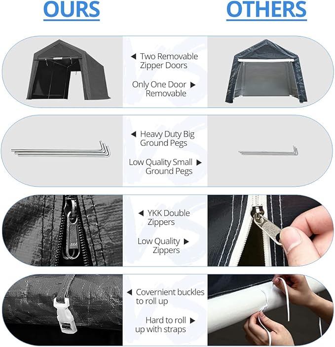 - 【Heavy Duty Durable Frame】✔1-1/2-inch diameter steel poles provide stability and strength to make the storage shelter carport safer. The garage storage tent is equipped with upgraded 0.32X11.81 inch (8X300mm) L-Type pegs, thickened and enlarged to increase stability.