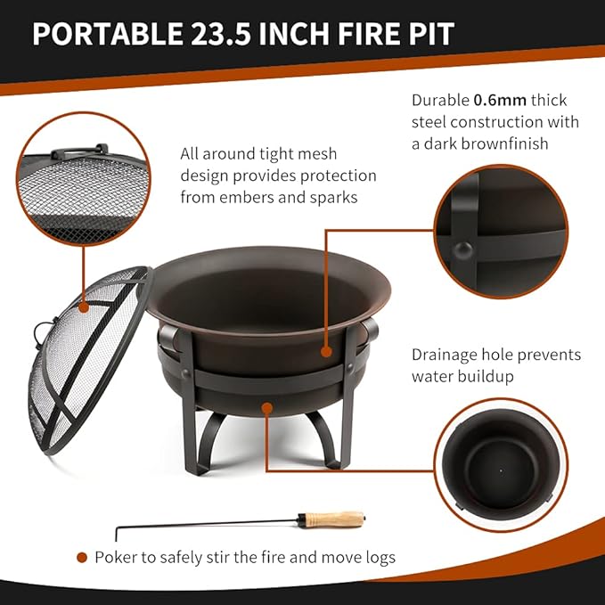 - Security: The spark screen provided can stop the sparks, embers, and debris from flying and splashing in those breeze nights and the poker can be used to assurance move the burning wood and charcoal