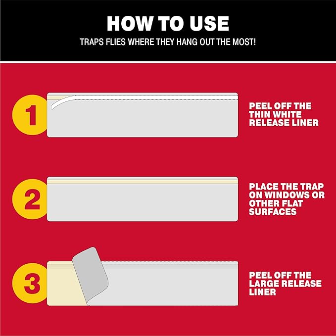 - READY TO USE: Extra Large Bug & Fly Clear Window Traps are waterproof, easy-to-apply, disposable, and non-toxic fly traps for indoors and outdoors. For best use, peel off the thin white lining and stick the bug and fly trap to a window sill, patio door or garage; remove the rest of the lining and let the trap take care of your flying insect problems! Our products are tested under the harshest field conditions to ensure maximum reliability for any level of home defense against pests.