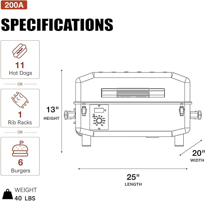- Portable Design - With dimensions of 25" x 20" x 13" and a 202-square-inch cooking area, this portable grill is ideal for small families, apartment dwellers, campers, RVers, and solo grillers.