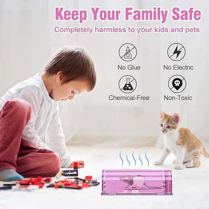 4 Pcs Humane Mouse Traps No Kill, Live Mouse Traps Indoor for Home, Reusable Mice Small Rat Trap Catcher for House & Outdoors(Pink)