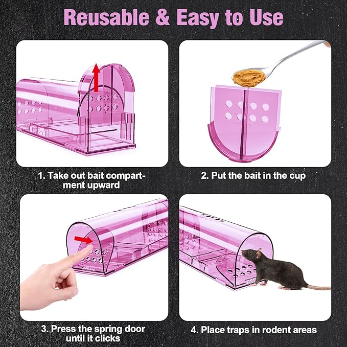 - Easy to Use: Open the humane mouse traps tail door, place the bait in the food compartment and after that open the rat traps indoor for home spring door. The mouse is going to enter this humane mouse traps, the spring door just closes in time. In order to catch mice more convenient, mouse traps no kill is suggested to put more bait to attract mice.