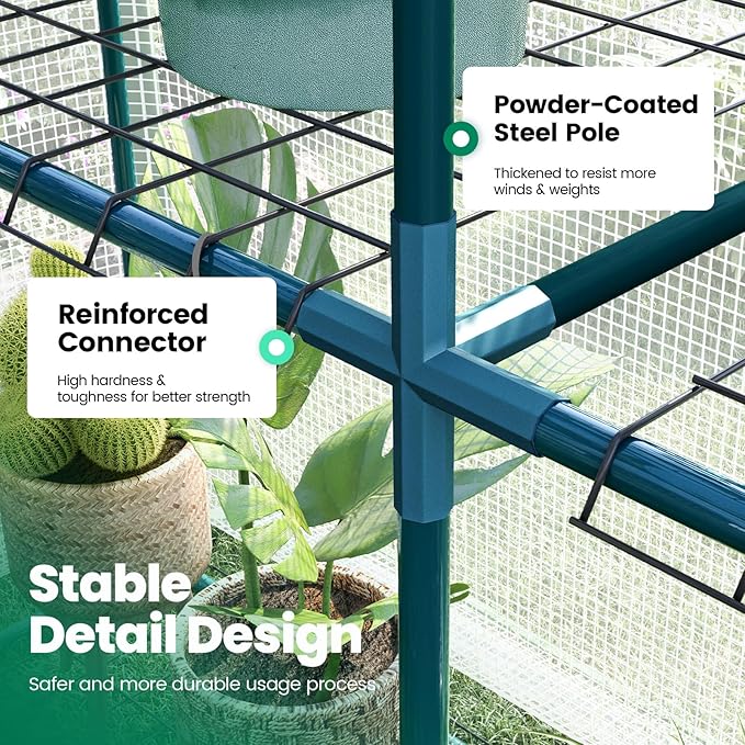 - [Upgraded Cover Material]--Reinforced 145g/ใก (Others: 135g/ใก) green PE grid cover which is added 6% Anti-UV inhibitor, makes longer greenhouse service life possible. No worries - all safe eco-friendly materials are selected to make your plants all good.