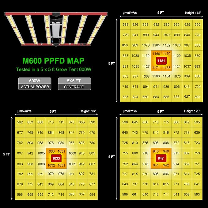 - MAXIMIZE YIELDS & CROP QUALITY - AGLEX M600 led plant growing light is with 2040PCS high efficient chips, only consumes 600w with 2040 LEDs, achieving higher average PPFD with 1442μmol/㎡/s at 5x5ft core coverage. The average yield is more than 2.5g per wattage. The 600w led bar grow light can help you achieve maximum quality and quantity. Wide Input Voltage 100-277V, can meet most input voltage.