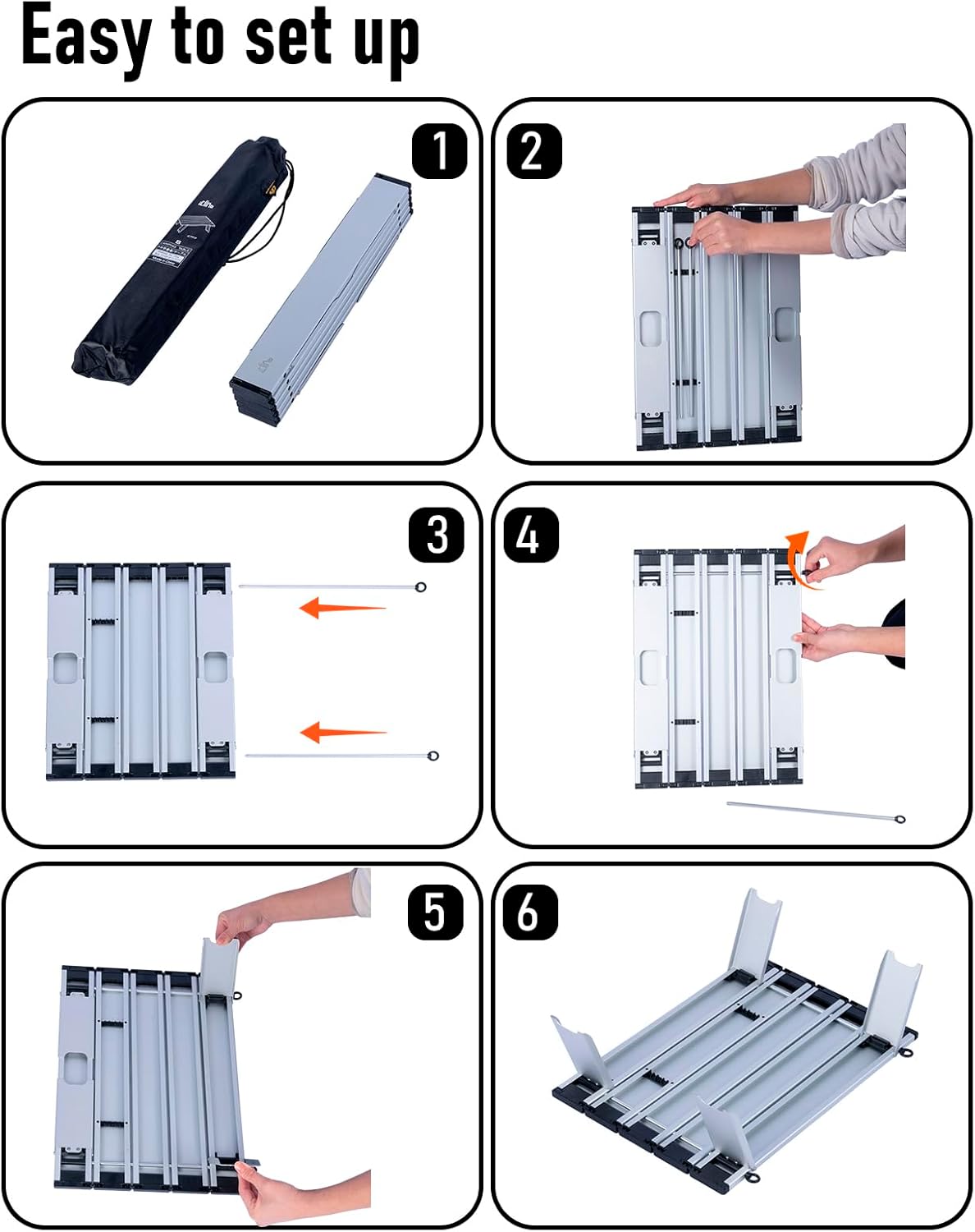 - Ultralight, made of high quality aluminum alloy 6063, only 2.4 lbs; Max Load 66 lbs; Unlike wooden or nylon-top tables, this table is durable, waterproof, corrosion-resistant, easy to clean; Heat resistant, can put your stove on