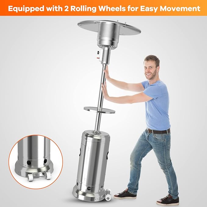 - Convenient Humanized Design: The tabletop is perfect for placing drinks and beverages when chatting with your friends. With the easy-opening door, you donโt need to lift the gas tank (not included) for installation, which saves you lots of effort. In addition, our outdoor heater has 2 smooth-rolling wheels for flexible movement.