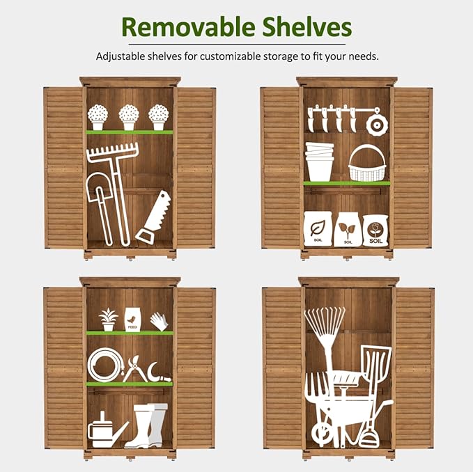 - Fir Wood Material: The vertical storage shed is made of high-quality fir wood, and the exterior has been polished to express a rustic style. Besides, the wooden shed is easy with other décor and natural settings.