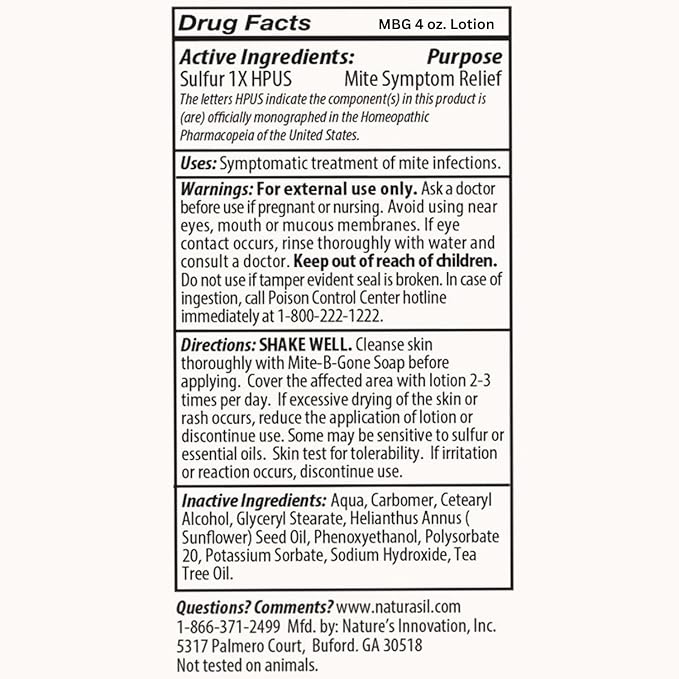 - Mite-B-Gone's Lotion is a 100% Natural Formula that includes Sunflower Seed Oil and Tea Tree Oil. This known soothing and anti-inflammatory blend quickly counteracts itching and progressively clears up discomfort.