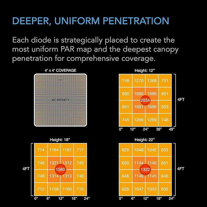 - Algorithmically positioned diodes create the most uniform PAR map and the deepest canopy penetration.