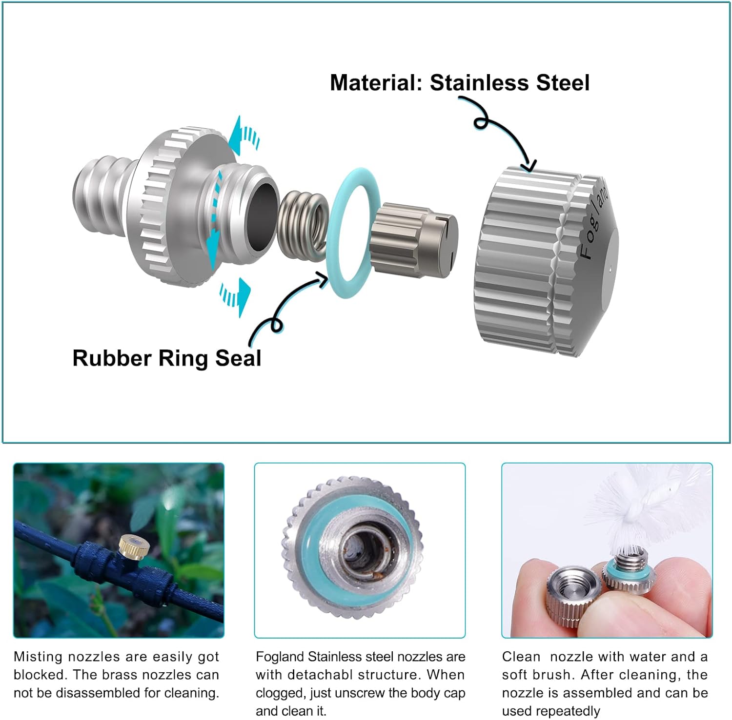 - [Anti-clogging]: Fogland newly upgraded misting nozzle adopts a detachable body design and has an anti-clogging function. When the fog nozzle is blocked and the flow is small or the spray performance is poor, just disassemble the nozzle and clean it under running water with a soft brush. The cleanable and reusable nozzle will save you money!