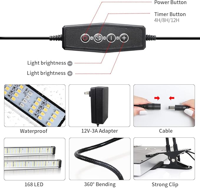 - 【Super Bright with More Heat Production】built-in 144 white + 10 red LED beads, the grow lamp is similar to the full spectrum sunlight at noon,that is professionally designed for indoor garden plants.Also,this growing light connect with 12V 3A adapter,which illumination will be more stable, brighter,and more efficient.