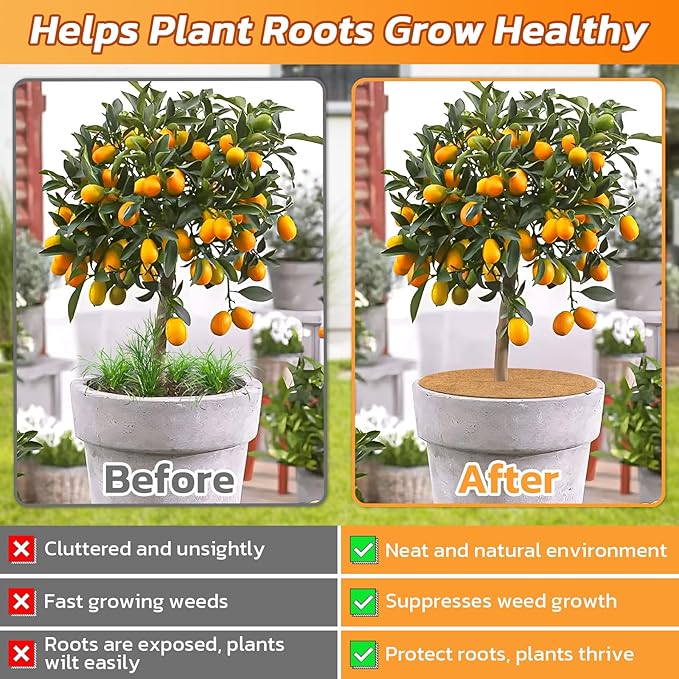 - GREAT Endurance & Moisturization: Our coco mulch disc ring is 1/4" thick, coco mat is the perfect way to mulch the plants to aid in holding water, it can well maintain the moisture of soil in the plant pots, keep the plant needed moisture and mimeral and prevent plants from drying out